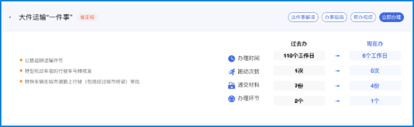 “大件运输一件事”是国务院“高效办成一件事”改革中聚焦的重点事项之一,适用于申请公路超限运输许可、特型机动车临时行驶车号牌核发、特殊车辆在城市道路上行驶(包括经过城市桥梁)审批等政务服务事项的集成办理。经营者可通过统一平台一次性提交全部申请材料,审批部门并联办理相关事项,实现“一窗受理、一次办结”,有效提升大件运输政务服务效率。