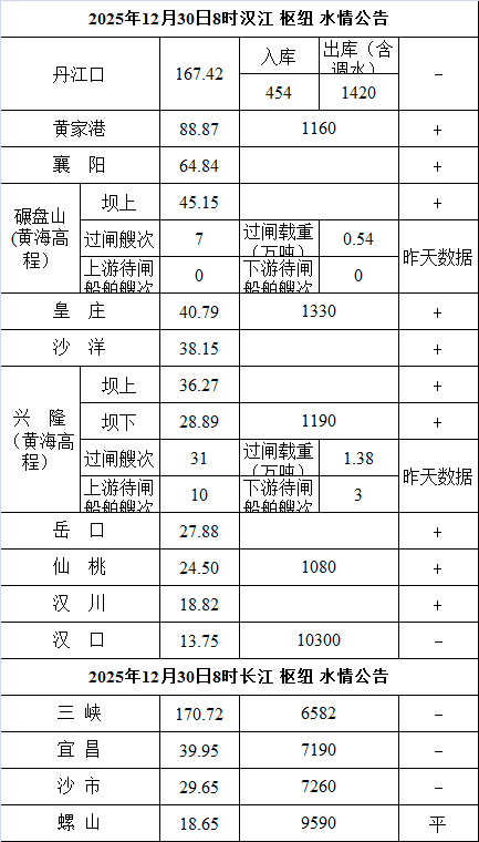 水情公告(2025年12月30日8时)