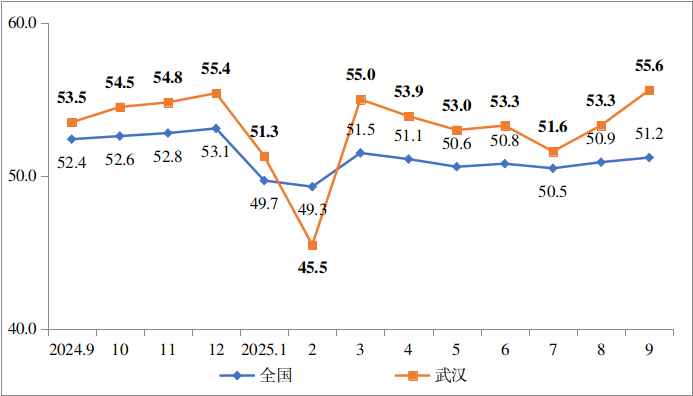 图1 2024年9月-2025年9月全国和武汉物流业景气指数走势图