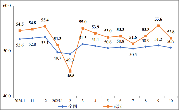 1 202410月-202510月全国和武汉物流业景气指数走势图