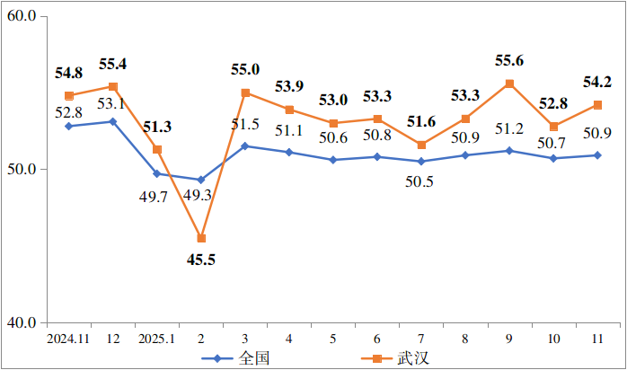 图1 202411月-202511月全国和武汉物流业景气指数走势图