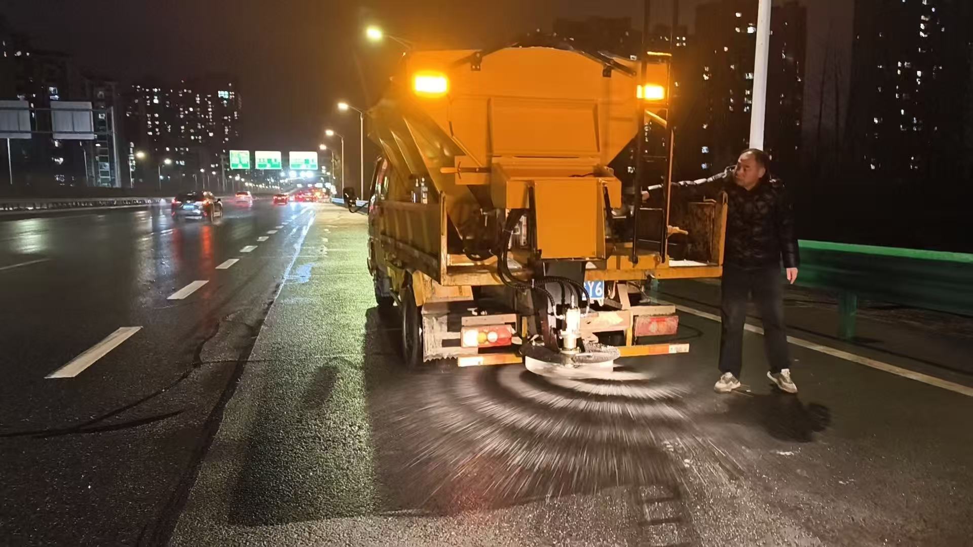 1月19日上午,气温持续下降,虽然大雪未到,但武荆高速已在7时30分开展全线融雪剂撒布;机场高速11时开始对机场一、二通道进行全线撒布作业,撒布融雪剂30吨,保障进出机场旅客通行顺畅;四环线、武嘉、武大、武松高速10时开始进行预撒布作业,投入警戒巡查车27台次;武汉市域高速公路被划分为10个循环作业区,布设20台铲撒一体机,4台液体融雪剂撒布车,时刻待命。