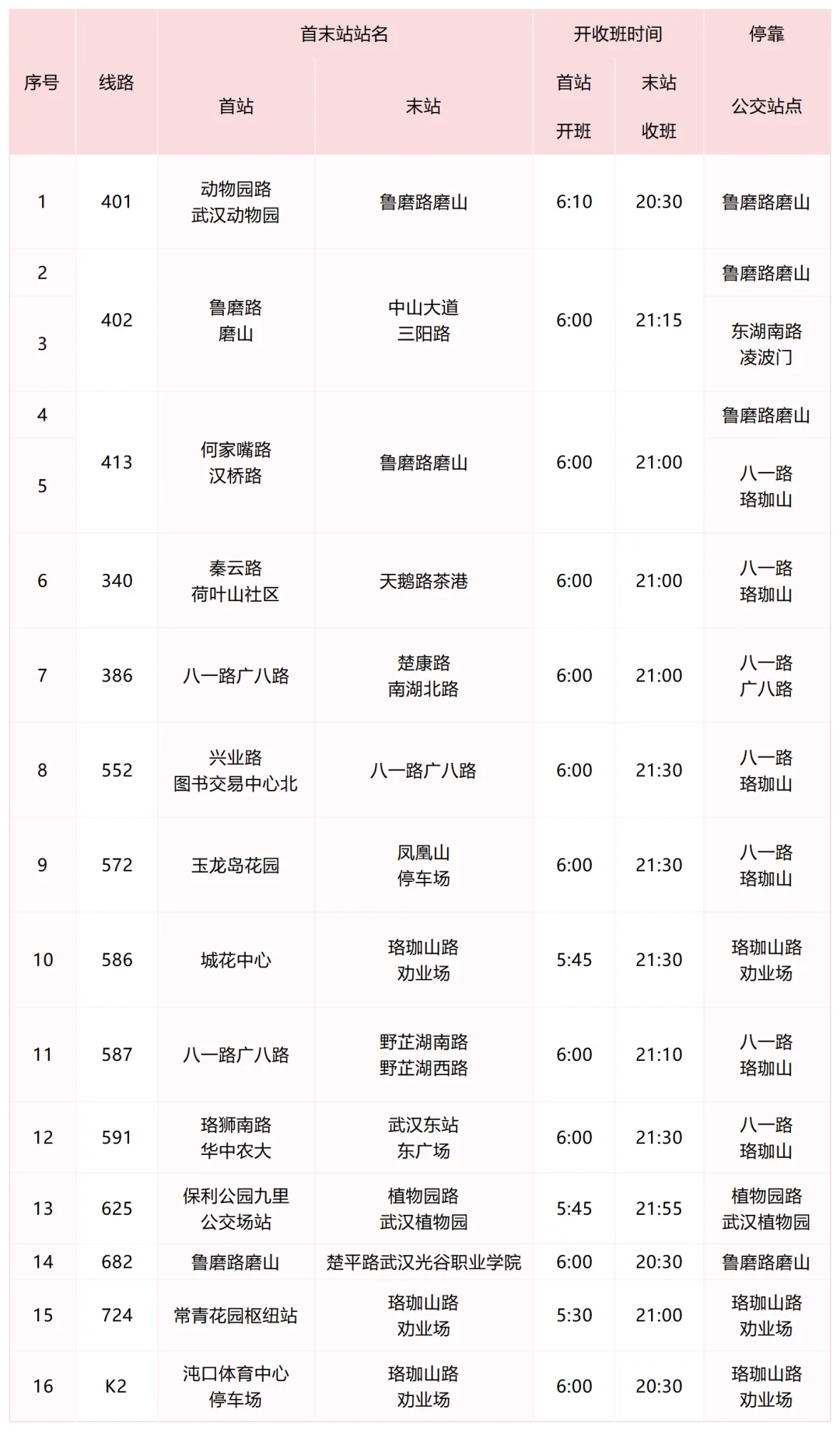 东湖樱园:从磨山、植物园始发的5条公交线路——401、402、413、625、682路,将根据客流情况动态增加班次。