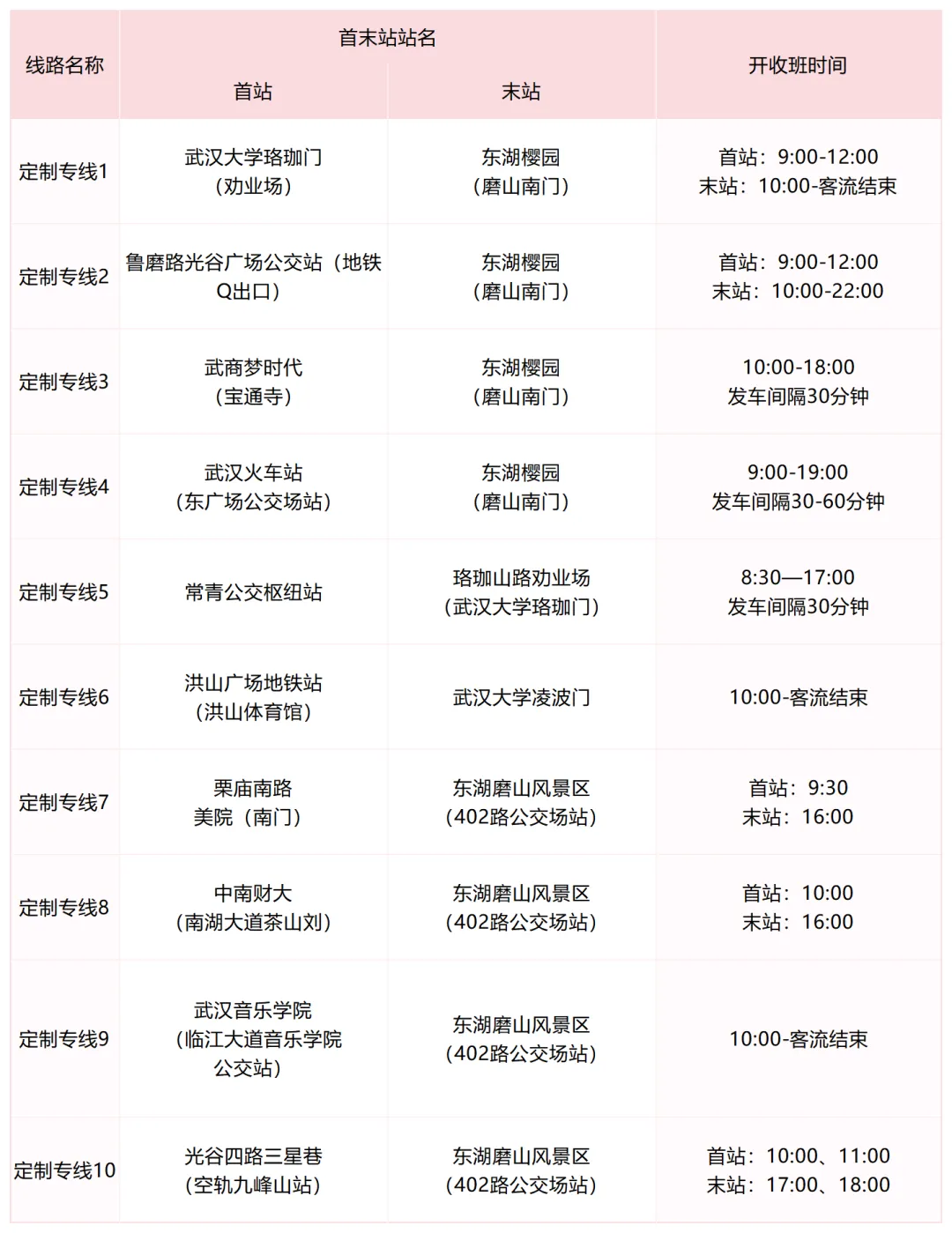 定制专线10:光谷四路三星巷(空轨九峰站)-森林大道-珞瑜路-喻家湖-鲁磨路-东湖磨山风景区(402路公交场站)