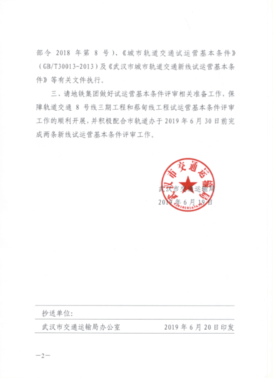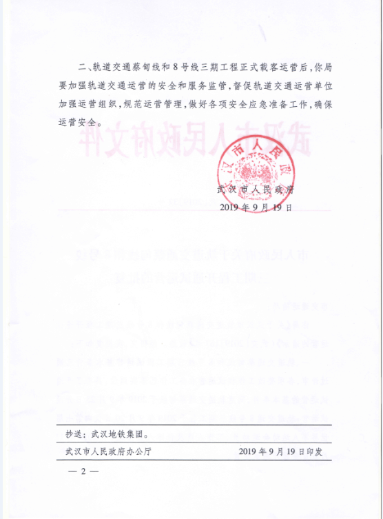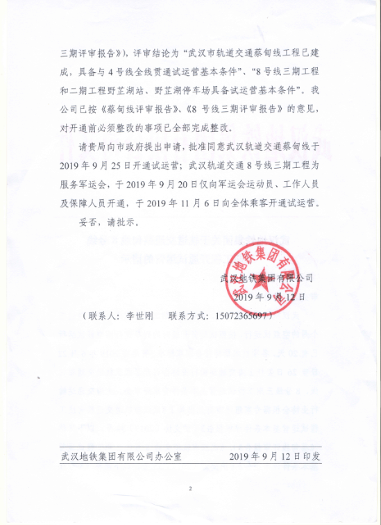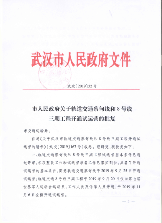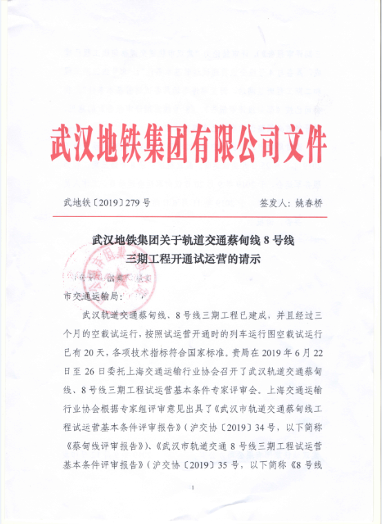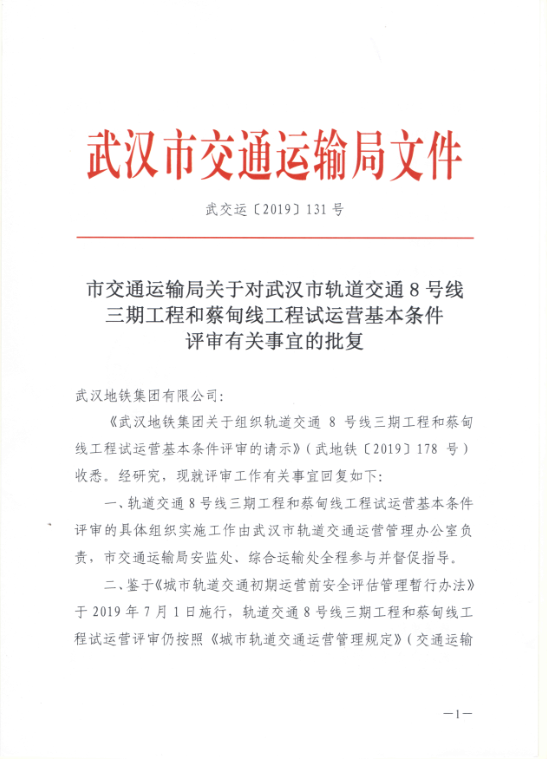 9月6日地铁集团向我局提交了《关于轨道交通蔡甸线、8号线三期工程开通试运营的请示》(武地铁【2019】279号)。9月9日,市轨道办、局综合协调处、客运处、法规处、安全应急处、规划处、建设处专题研究了轨道交通蔡甸线、8号线三期工程开通试运营相关事宜,认为轨道交通蔡甸线、8号线三期工程评审工作程序内容规范,试运营前必须整改问题全部完成,相关手续齐备,已具备开通试运营条件,建议局办公会通过后相关部门报请市人民政府批准开通试运营。