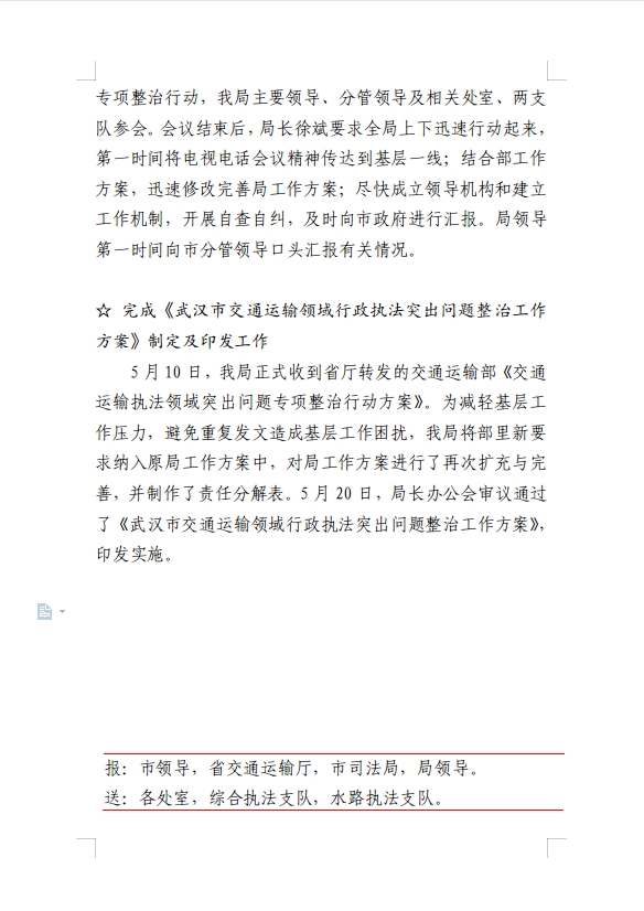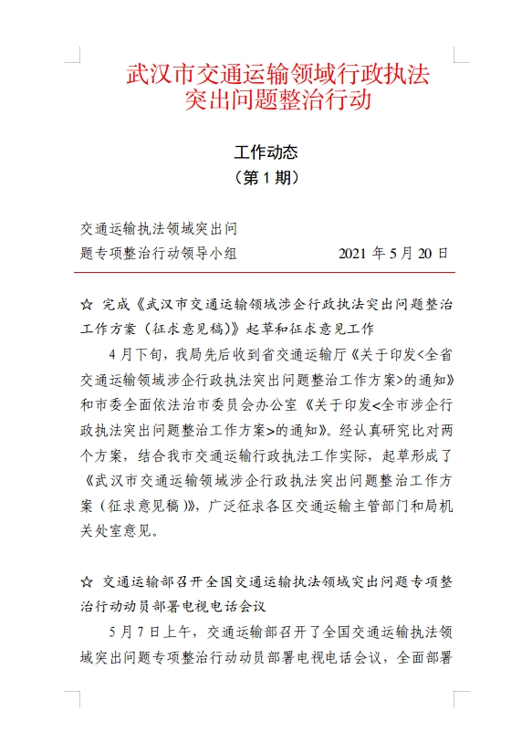 武汉市交通运输领域行政执法突出问题整治行动工作动态(第1期)